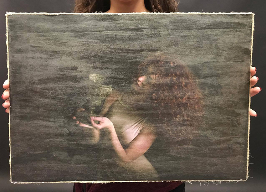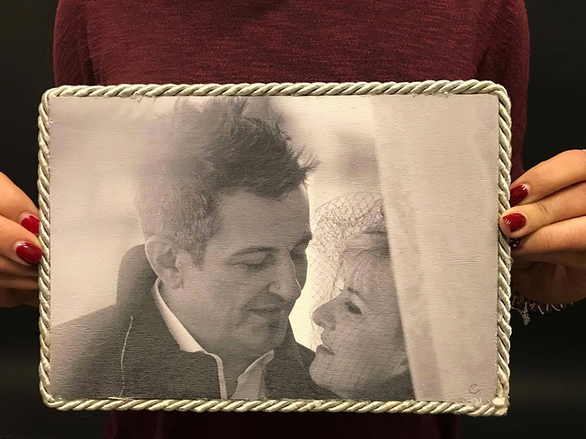 Si parte dal soggetto, si passa allo scatto con una post produzione già basata su un effetto vintage per poi lavorare la lastra di legno su cui andrà stampata la fotografia.