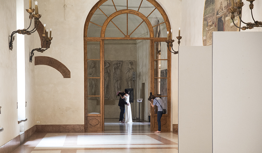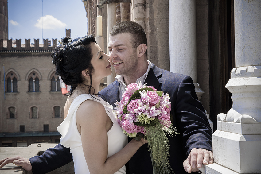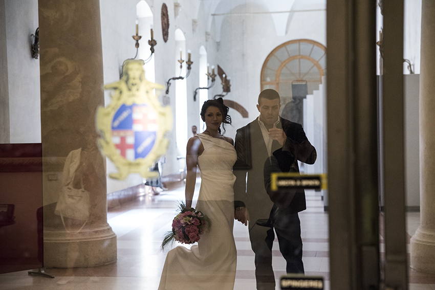 Francesca e Filippo hanno scelto la Sala Rossa del Comune di Bologna per il loro matrimonio. Fa caldo, ma per fortuna l’umidità non è a livelli mostruosi.
