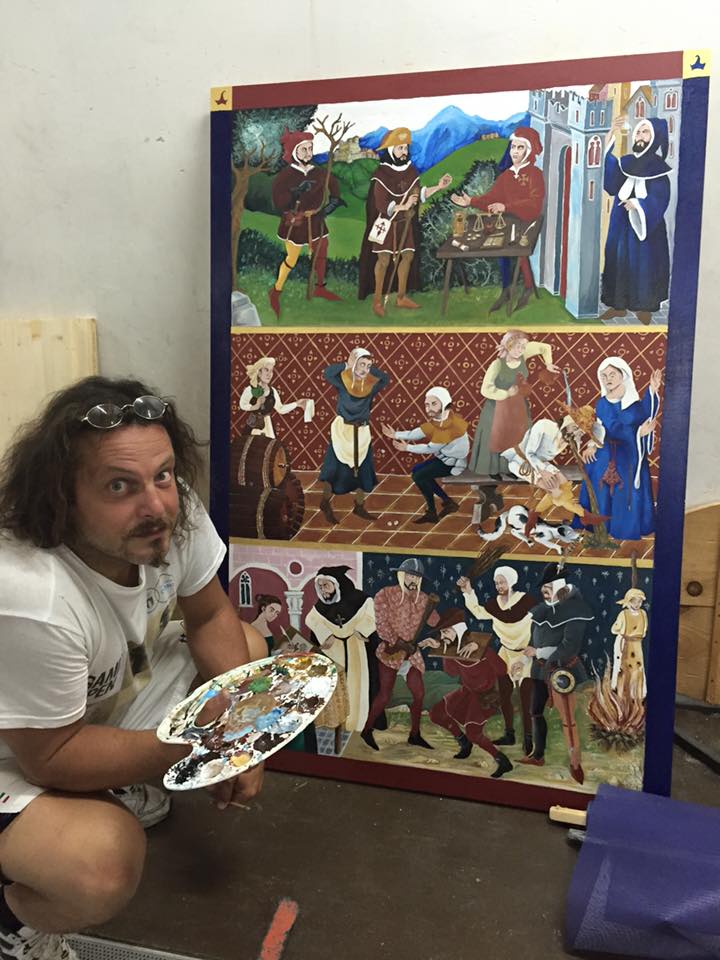 Qui vediamo, ad esempio, il Maestro d’arme Davide Lazzaroni mentre completa il dipinto effettuato con Isabella Panzera che rappresenta tutti i componenti del gruppo storico seguendo le iconografie del tempo con prospettive e colori.
